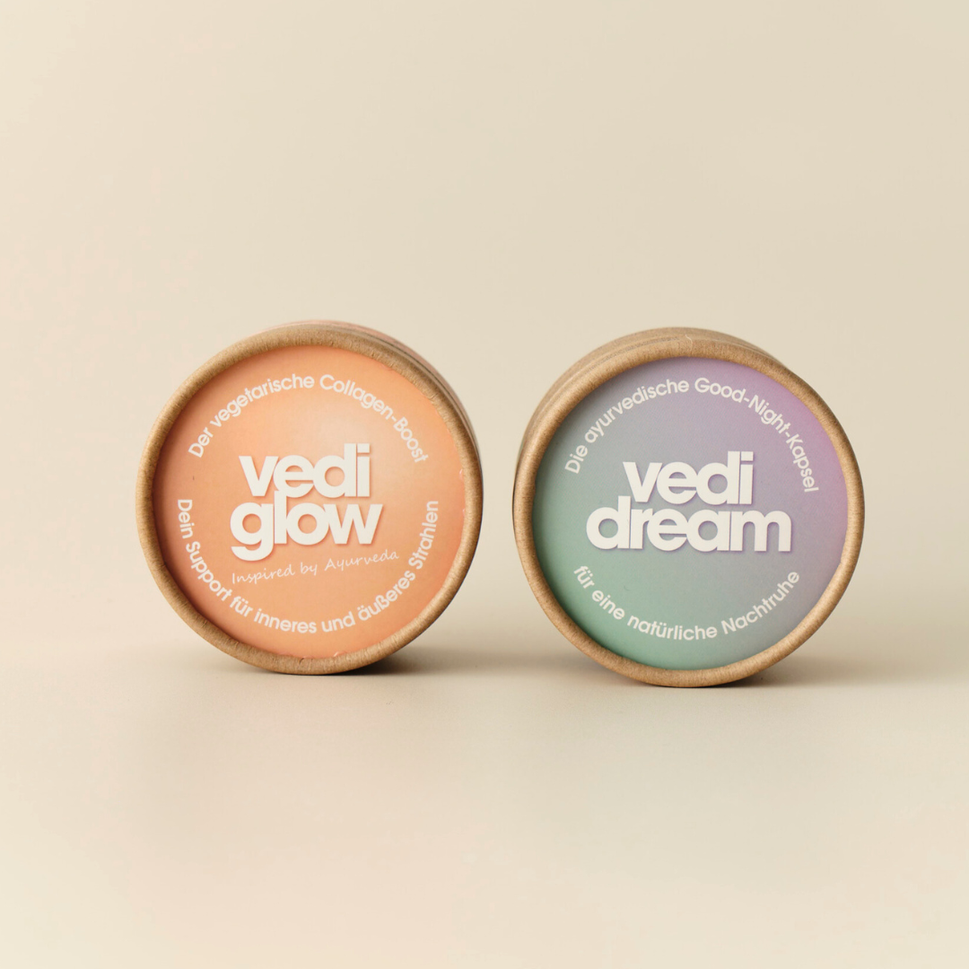 vedi dream begleitet Dich mit ausgewählten Pflanzenextrakten durch Deine Abendroutine. vedi glow ergänzt Deine tägliche Pflege von innen – mit natürlichen Kollagenbestandteilen und pflanzlich inspirierten Inhaltsstoffen.
